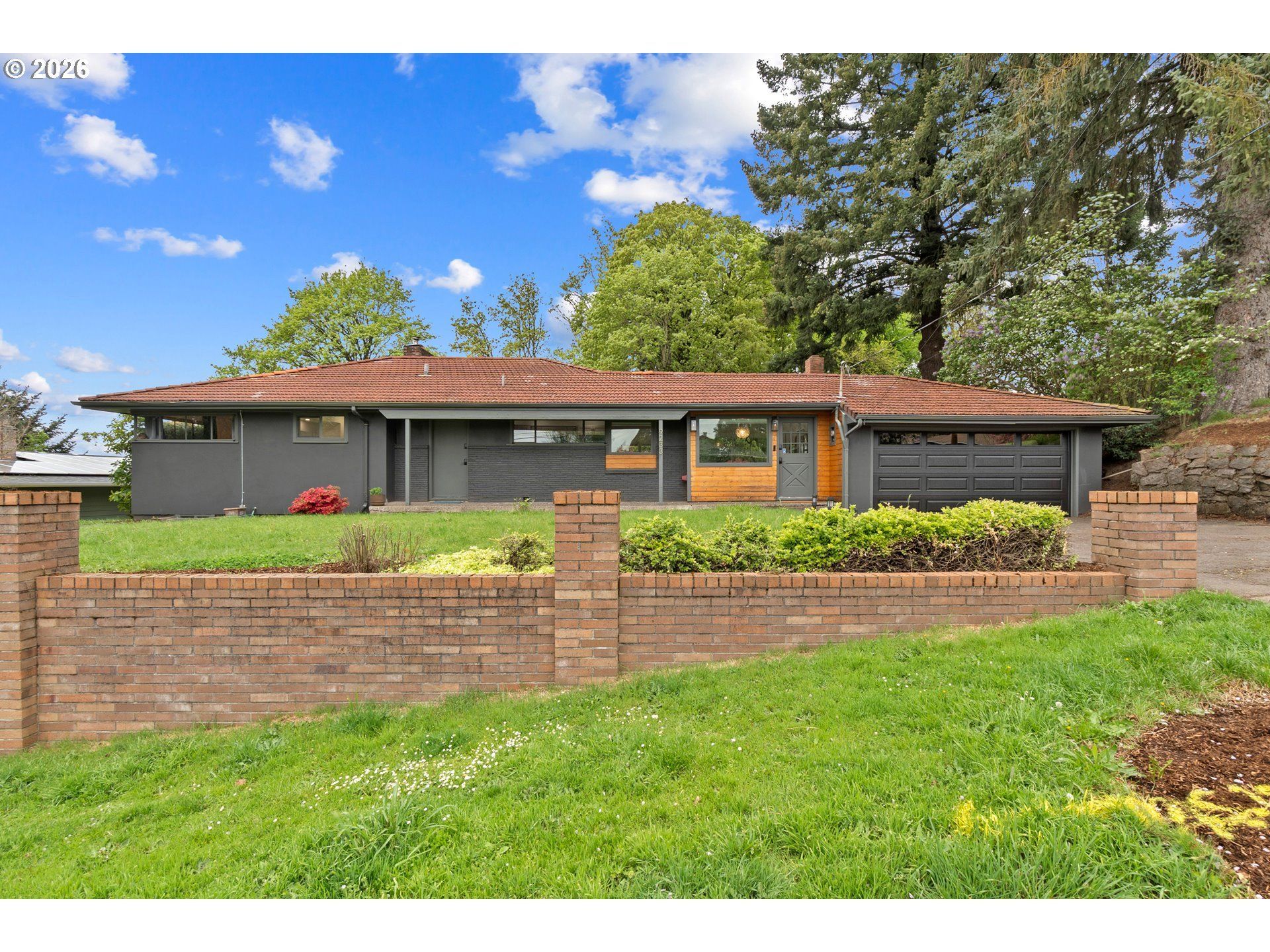 Updated Mid-Century Daylight Ranch in Lents, elevated on a sunny hillside. Thoughtfully refreshed while preserving its mid-century character, the home features refinished original hardwood floors and a spacious living room with floor-to-ceiling windows, a classic wood-burning fireplace, and views of the lush backyard. Top-down blackout blinds add comfort and flexibility. Two generous bedrooms sit on the main level along with a mini-split system for efficient heating and cooling. The daylight lower level has been freshly painted and previously updated with oak-style laminate flooring. A large third bedroom functions beautifully as the primary suite, offering direct access to the renovated full bathroom with a walk-in shower, dual vanity, and terrazzo tile flooring. The nearly 1/3-acre lot unfolds across tiered outdoor spaces, including a stone patio, lower lawn, and multiple garden areas-an ideal setup for summer gatherings, play, or future landscaping visions. Seasonal views shift throughout the year, creating a serene backdrop. An oversized two-car garage with a new automatic door provides excellent storage and workspace, with additional parking available in the long driveway. Convenient access to I-205, Johnson Creek shopping, and Clackamas Town Center rounds out this well-located, move-in-ready home. See our virtual tour links for more information!
